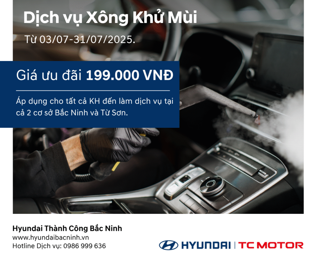 Từ ngày 03/07 đến 31/07/2025, Hyundai Thành Công Bắc Ninh triển khai chương trình ưu đãi dịch vụ xông khử mùi nội thất với giá