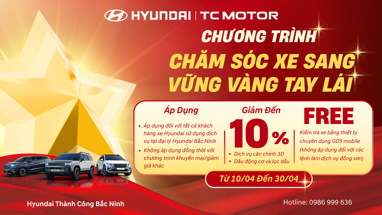 Nhằm mang đến trải nghiệm lái xe an toàn và tối ưu hiệu suất vận hành, Hyundai Bắc Ninh triển khai chương trình “Chăm Sóc Xe Sang – Vững Vàng Tay Lái” với nhiều ưu đãi hấp dẫn dành cho khách hàng.